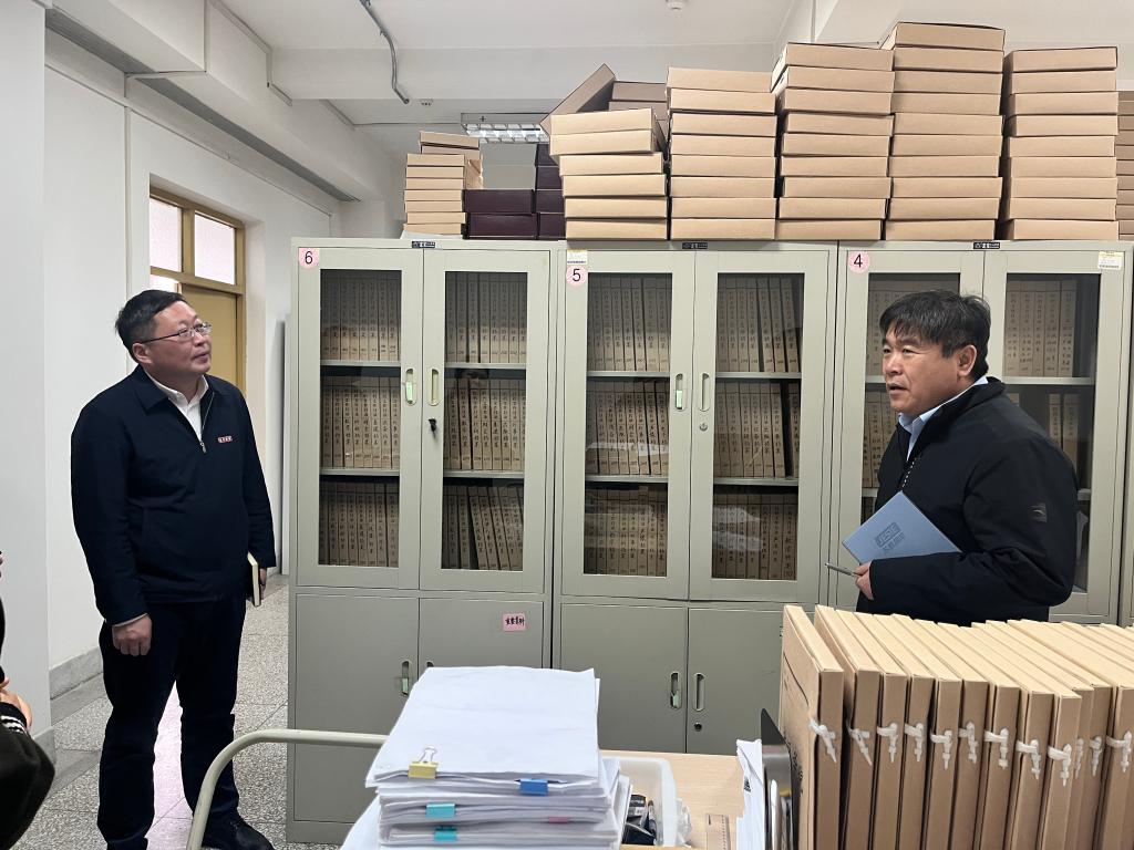 11月23日上午,校党委副书记田一聚、副校长童毛弟到学校综合档案室调研指导档案工作。