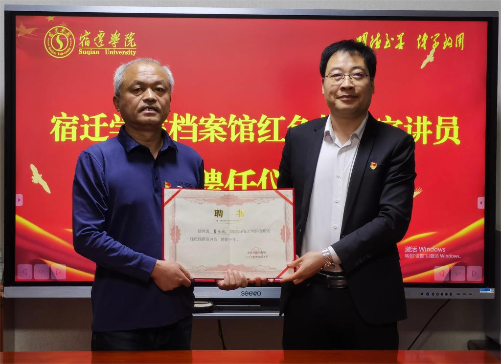 4月15日下午,档案馆在行政楼三楼会议室举行红色档案宣讲员聘任仪式,正式聘任信息工程学院办公室主任曹志成老师为“宿迁学院档案馆红色档案宣讲员”。聘任仪式由档案馆主任朱青梅主持,党委办公室、校长办公室副主任徐权出席活动并讲话。徐权指出,红色档案是中国共产党的历史文化遗产,承载了党的奋斗历程,记录了革命先辈们的不懈努力和献身精神。红色党史文化教育是高校思想政治教育的重要内容,能够让广大学生了解党的历史,铭记党的光辉历程,传承红色基因,培养学生奋发努力建设祖国的责任和使命。曹志成老师表示,一定担负起“红色档案宣讲员”的职责,为践行档案育人功能、加强学校内涵建设贡献自己最大的力量。曹志成老师还向档案馆捐赠了一套《朱瑞研究》书籍。